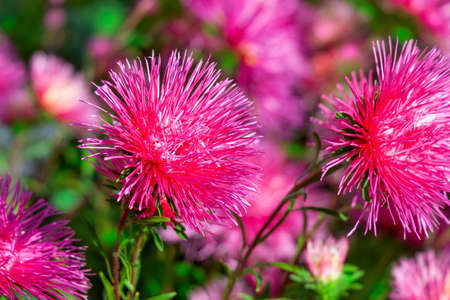 Landscape nature background of beautiful pink Aster flowers in garden. Selective focus.