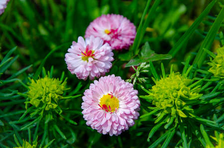 pink daisies, family of asteraceae, blooms beautifully in the flower bed. High quality photo