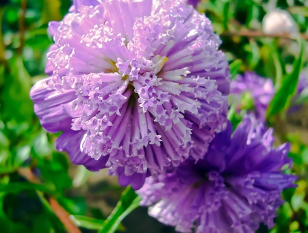 The purple double flowered aster flowers that bloom in full bloom in the autumn garden are beautiful.