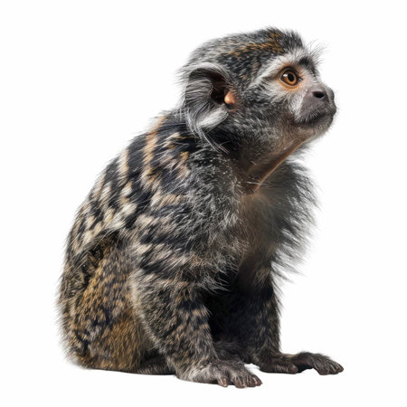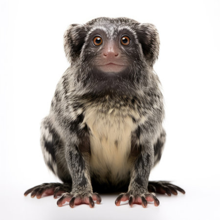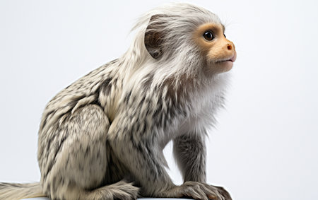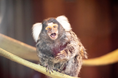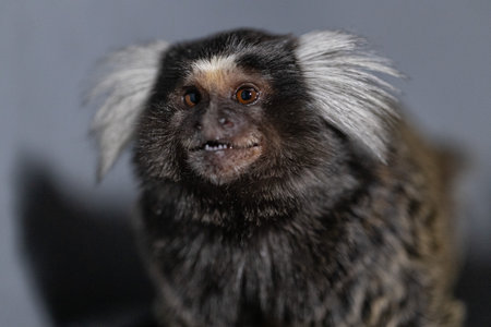 marmoset displays its fluffy ears and curious expression. The small primate stands on a dark surface highlighting its unique features in a close up view. Its lively eyes invite admiration.