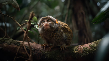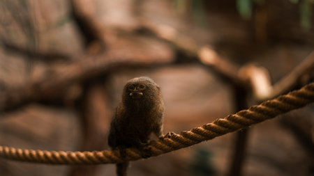 An endearing, high-resolution photograph portrays a pygmy marmoset during a tiny adventure in the Amazon canopy, reflecting its miniature size and arboreal lifestyle.
