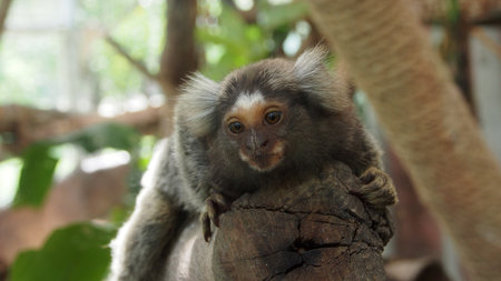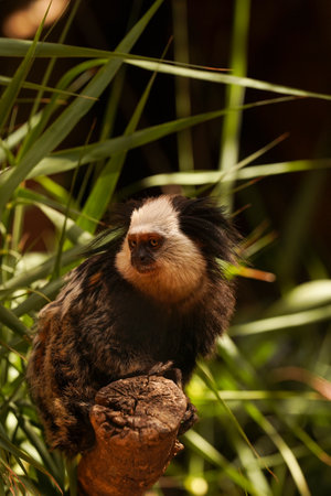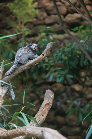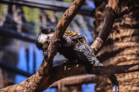 Monkeys black-tufted marmoset or titi de penachos negros sitting on branch tree in zoo