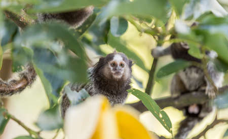 worried monkey face. Small monkey Callithrix penicillata in danger of extinction. several monkeys in a tree.