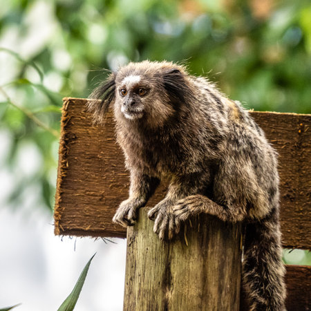 Marmoset Monkey in green tropical jungle rainforest on fence bench in Rio de Janeiro State of Rio de Janeiro Brazil.