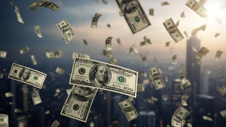 American currency notes are falling from the sky against a backdrop of towering office buildings, suggesting a financial or economic event.