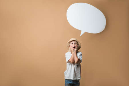 A boy in a hat stands on an orange background and shows different emotions. The boy is very happy. Of the boy there is an empty white speech