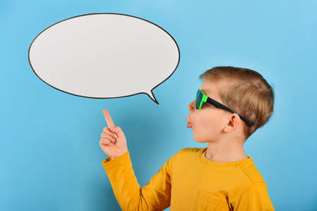 The boy shows on a blank poster for the inscription in the form of a cloud on a blue background.