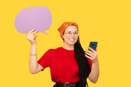 A photo of a girl holding a bubble speech and a phone