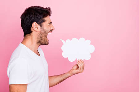 Profile side photo of funky crazy indian man hold paper card bubble speech cloud yell sales discount share private information wear white outfit isolated over pastel color background