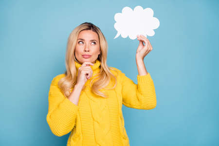 Photo of amazing blond lady holding paper mind cloud thinking over creative dialogue answer hand on chin wear knitted yellow pullover isolated blue color background