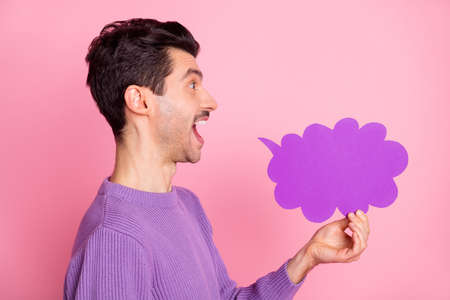 Photo of funky attractive guy wear violet sweater speaking cloud looking empty space copyspace isolated pink color background