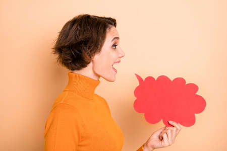 Profile side photo of young pretty lovely happy positive excited girl talk with cloud bubble isolated on beige color background