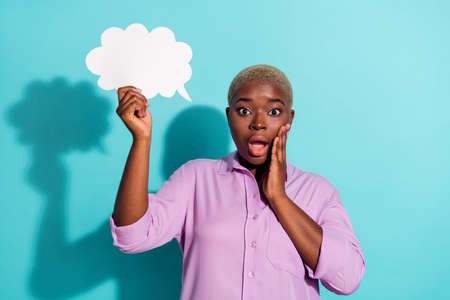 Profile side view portrait of attractive cheerful girl holding cloud copy space saying news isolated over bright teal turquoise color background