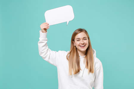 Cheerful young woman girl in casual white hoodie posing isolated on blue turquoise background studio portrait. People lifestyle concept. Mock up copy space. Hold empty blank Say cloud, speech bubble.