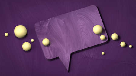 Empty scene with violet speech bubble and yellow spherical pearls. Fashion showcase, display case, shopfront. 3d rendering.