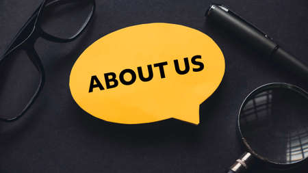Top view of glasses, pen, magnifying glasses and yellow speech bubble written with About Us.