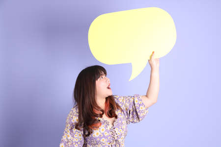 The chubby Asian woman standing on the purple background with the casual clothes.