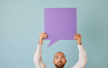 Anonymous adult male holding in hand one square shaped purple mockup copyspace speech bubble on blue background. Man showing violet message balloon with free, blank, clean space for expressing opinion