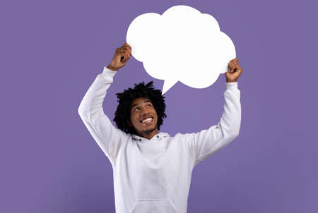 Handsome black teenager holding empty speech bubble above his head on violet studio background, mockup