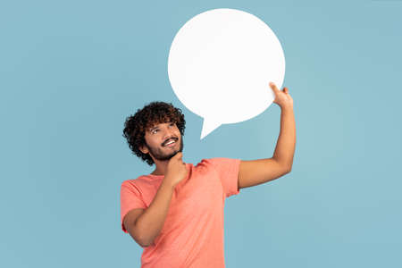 Pensive indian man holding blank speech bubble on blue, thinking
