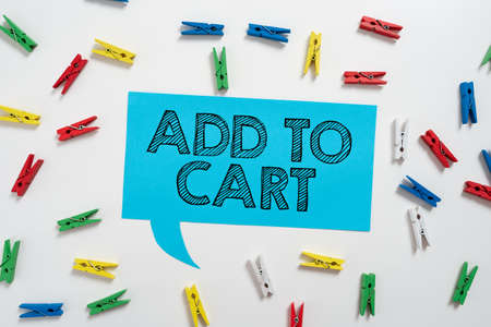 Sign displaying Add To Cart. Business idea Online purchasing ecommerce modern technologies to shop Colorful Pegs Placed Around Speech Bubble With Important Information.
