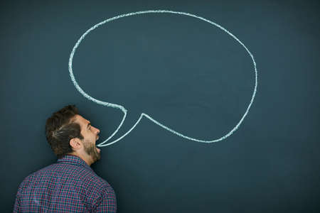 Im getting this off my chest. Shot of a young man standing in front of a blackboard with a speech bubble drawn on it.