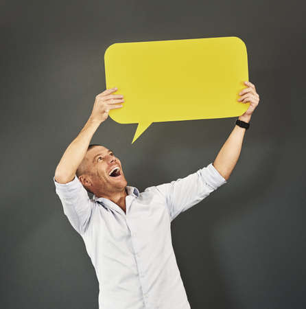 Happy man shouting fantastic news with speech ballon in hand.