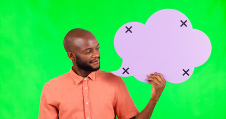 Speech bubble, space and a black man on green screen in studio for social media communication. Portrait, marketing or advertising and a male brand ambassador holding mock up with tracking markers