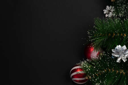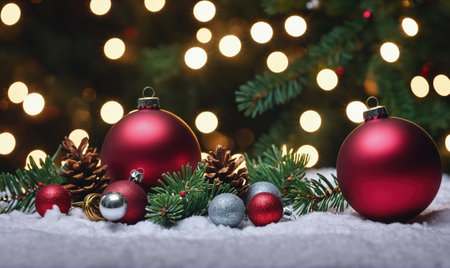 Christmas and New Year background with fir branches, Christmas balls and bokeh