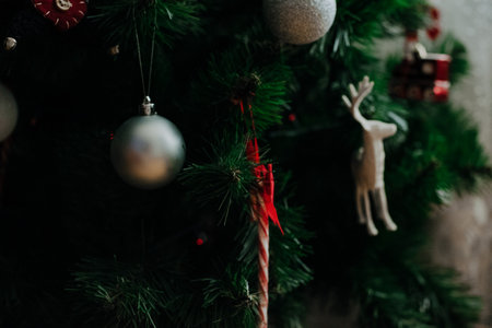 Christmas tree branches adorned with ornaments, colorful decorations, and twinkling lights, festive holiday scene.