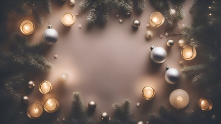Christmas background with fir branches. candles and balls. Top view with copy space