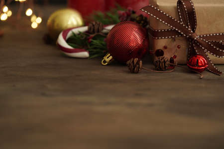 Christmas decorations.Gift box, Christmas candy, fir branches, balls on a wooden background, selective focus.Christmas and New Year concept.Copy spaec.