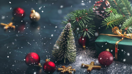 Christmas decorations with red baubles and berries on lush green pine branches. The dark green glittery background adds elegance to the festive composition.