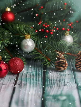 Festive Christmas scene with fir branches, ornaments, and lights.