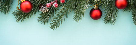 Simple modern Christmas background with pine greenery and ornaments.