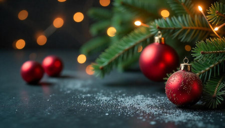 Two red ornaments rest beside pine branches on a dark surface creating a cozy holiday atmosphere perfect for Christmas decoration.