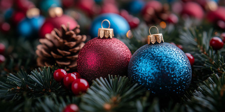 A close-up of vibrant red and blue glittery Christmas ornaments nestled in pine branches, surrounded by holly berries and a pine cone, creating a festive holiday atmosphere.