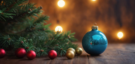 Close-up of Christmas ornaments and lights creating a warm, festive atmosphere on a rustic wooden surface. Perfect for holiday-themed designs.