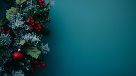 Classic Christmas Wreath on Teal Wall, Festive Holiday Decor, Minimalist Winter Background, Close Up