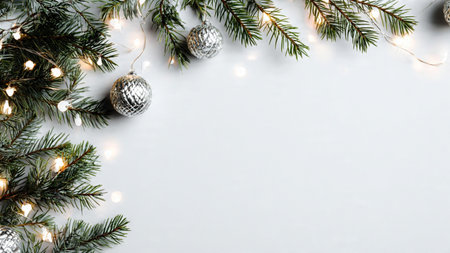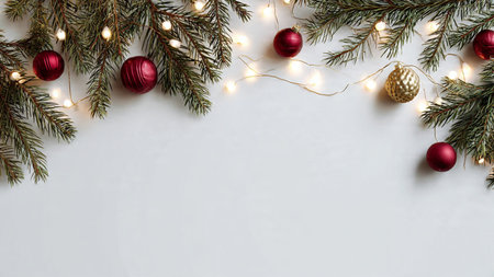 Elegant minimalist festive background with pine greenery and fairy lights.