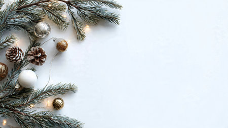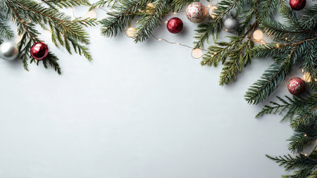 Minimalist Christmas background featuring pine branches, elegant ornaments, soft fairy lights, and clean white space for text in a modern high-resolution design.