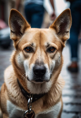 A curious dog stands on a bustling street, observing the vibrant activity around. Warm afternoon light casts gentle shades, capturing the lively atmosphere of town life.