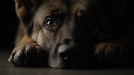 A dejected dog rests its head on its paws, eyes filled with sorrowful longing.