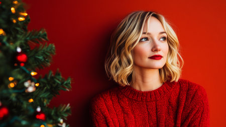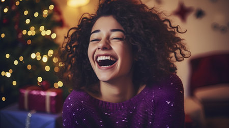 Portrait of beautiful smiling curly women near christmas tree. Celebration. Decor
