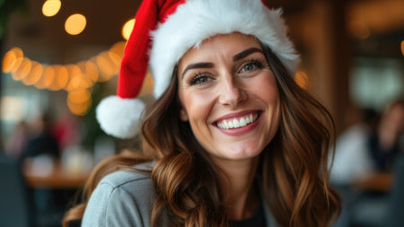 Beautiful girl with Santa hat holding a chalkboard with inscription Merry Christmas on background of Christmas decorations