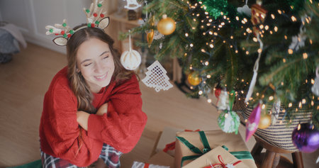 Smiling young woman taking Christmas selfie near decorated tree with gifts and festive lights
