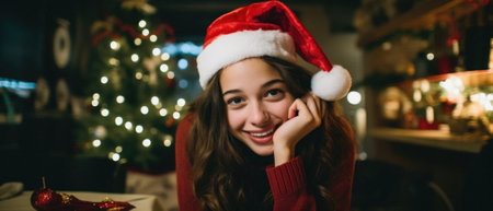 Cheerful young woman with long brunette hair wearing red white Christmas sweater and elf santa hat listening to the music with headphones under decorated Christmas tree near present boxes.
