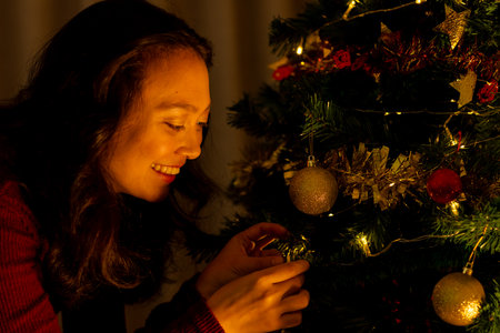 Happy asian woman decorating christmas tree at home and smiling. Christmas, celebration, tradition, domestic life and lifestyle, unaltered.