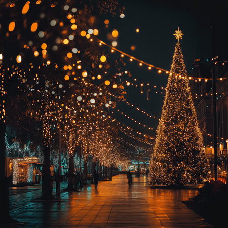 A captivating night scene showcasing a festive street filled with sparkling lights and illuminated trees, creating a warm holiday atmosphere in a charming town.