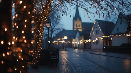 A picturesque street adorned with twinkling Christmas lights creates a magical atmosphere. The blend of vibrant colors enhances the festive spirit during a winter evening.
